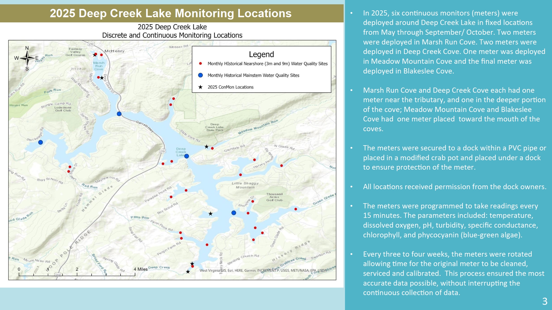 The DCWF’s Water Quality Meter Campaign was initiated in the early part of 2020. The Foundation realized that assisting the Department of Natural Resources (DNR) to deploy five “state of the art” meters is critical to ensuring good water quality in Deep Creek Lake (DCL) for both the near term and long term. Biologists and other DNR Staff identify, through the data collected by the meters, potential impacts on Water Quality for further investigation and/or the application of appropriate remedies. DNR reports summarized by year leveraging this important data are outlined below.